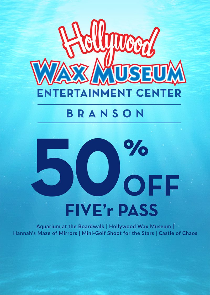 Get the Best Value in Branson with the All Access Pass or the FIVE’r Pass at your special rate. With the All Access Pass, you’ll be able to get into the action and snap pics with your favorite stars at the Hollywood Wax Museum, take the 18 steps to becoming a star at Shoot for the Stars Mini-Golf, make your way through hundreds of mirrored walls and archways in Hannah’s Maze of Mirrors, and compete for the highest score in a virtual adventure at Castle of Chaos.