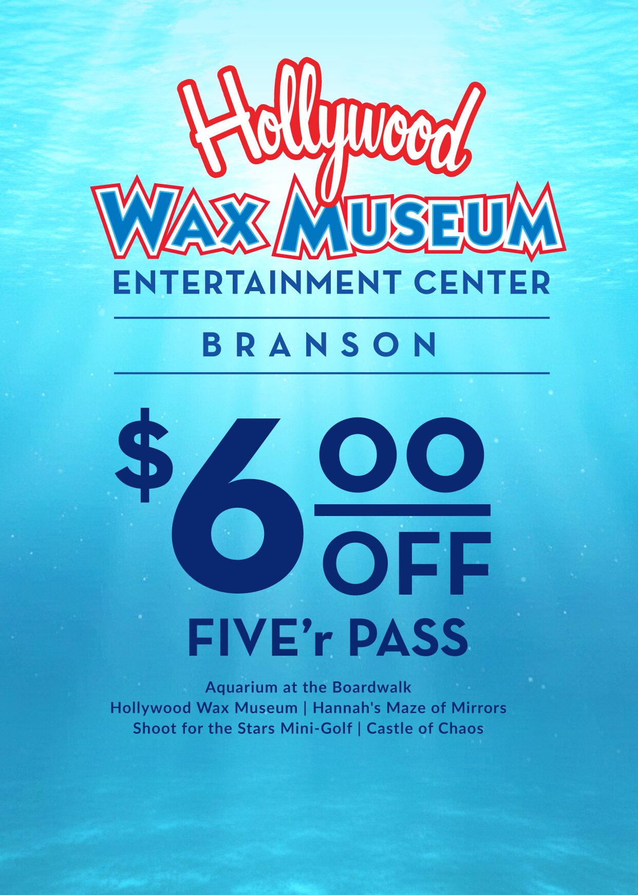 Looking to add the Aquarium? The FIVE’r Pass includes all four attractions at Hollywood Wax Museum Entertainment Center, plus Aquarium at the Boardwalk for a great deal.