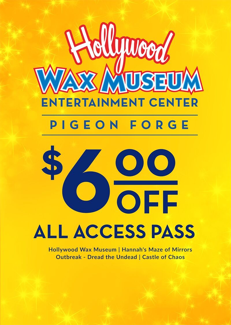 The All Access Pass is the Best Value in Pigeon Forge! And, you’ll save even more when you Buy Your Discounted Tickets Online Now. With your discount ticket package, you’ll get to take “selfies” with the stars at the Hollywood Wax Museum, make your way through hundreds of mirrored walls and archways in Hannah’s Maze of Mirrors, compete for the highest score in a virtual adventure at Castle of Chaos, AND have some scary fun while saving the world from hordes of zombies at Outbreak – Dread the Undead.